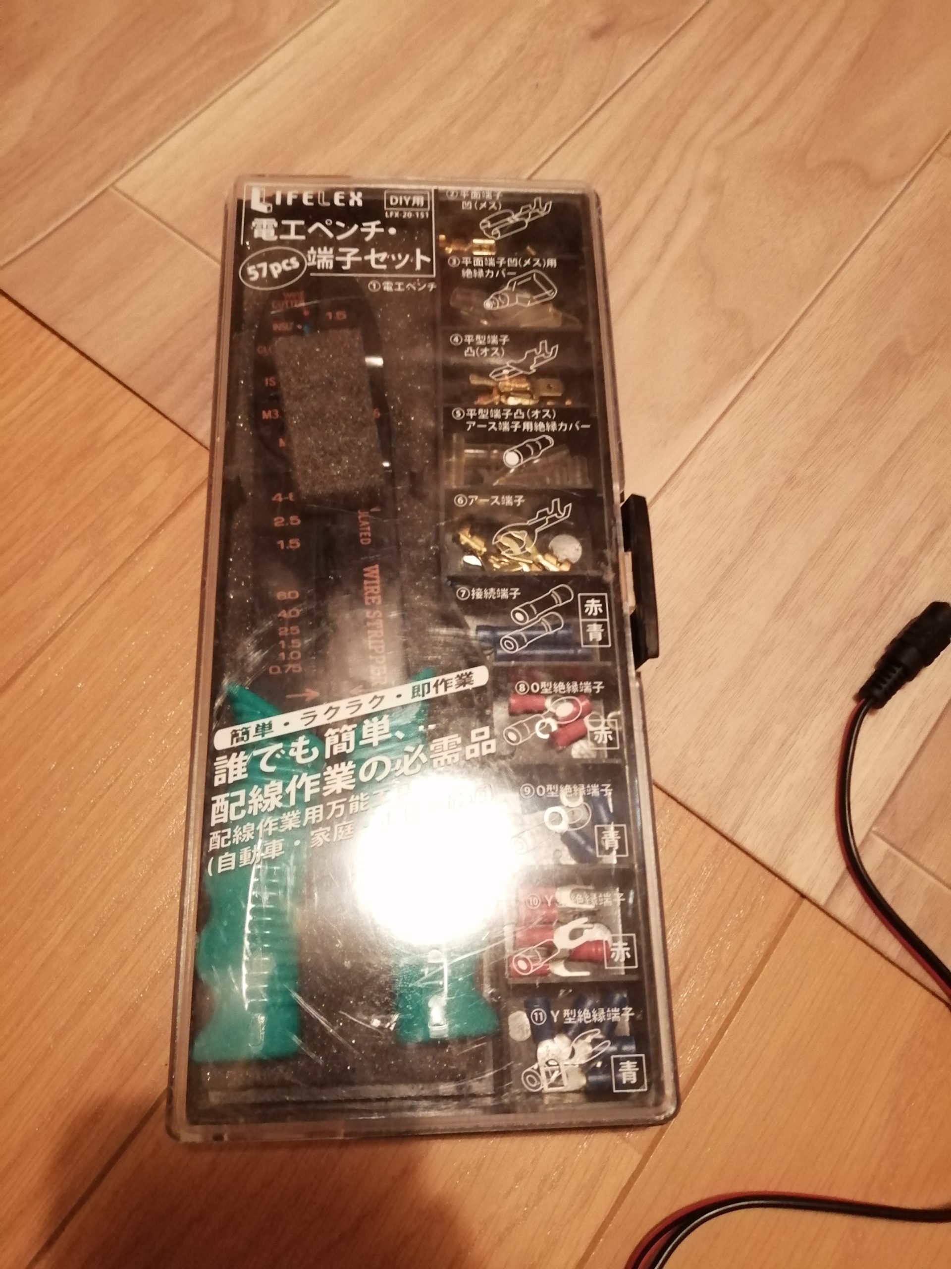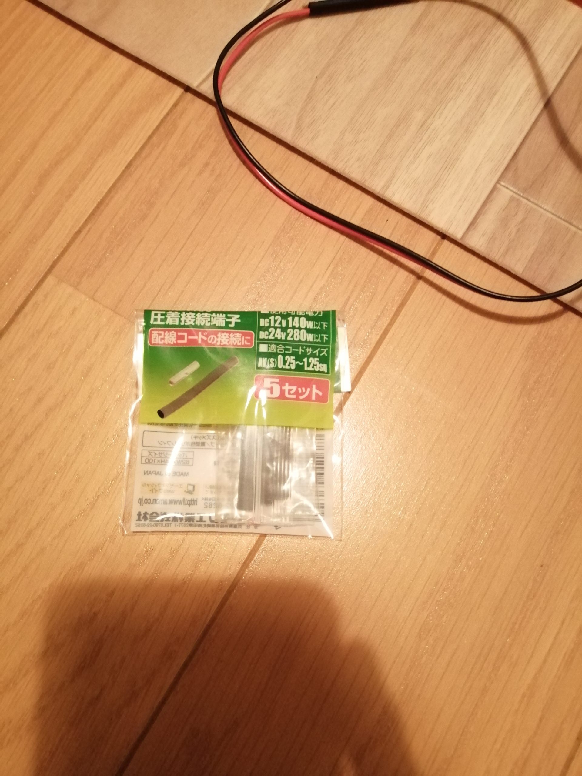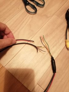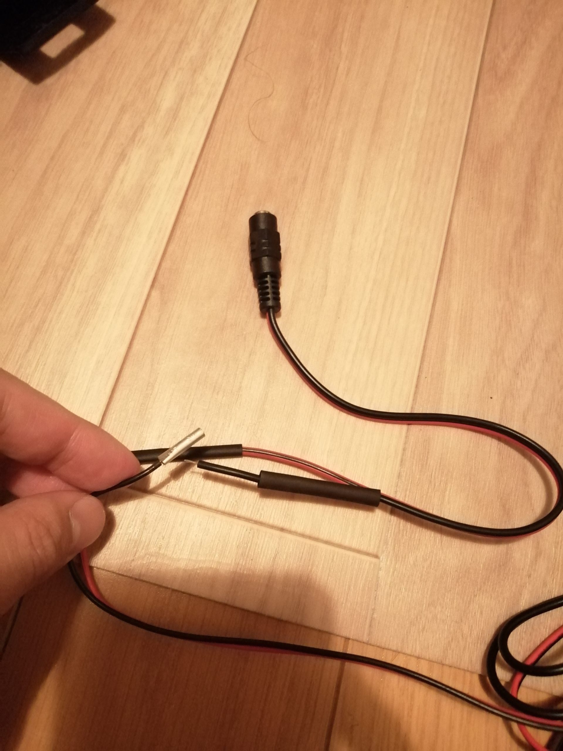 まずはカメラの電源端子処理から。カメラ電源線とdc12v端子メスの素線同士を圧着端子でつける。つけたら熱収縮チューブで処置。その後、電源つないで動作確認した。