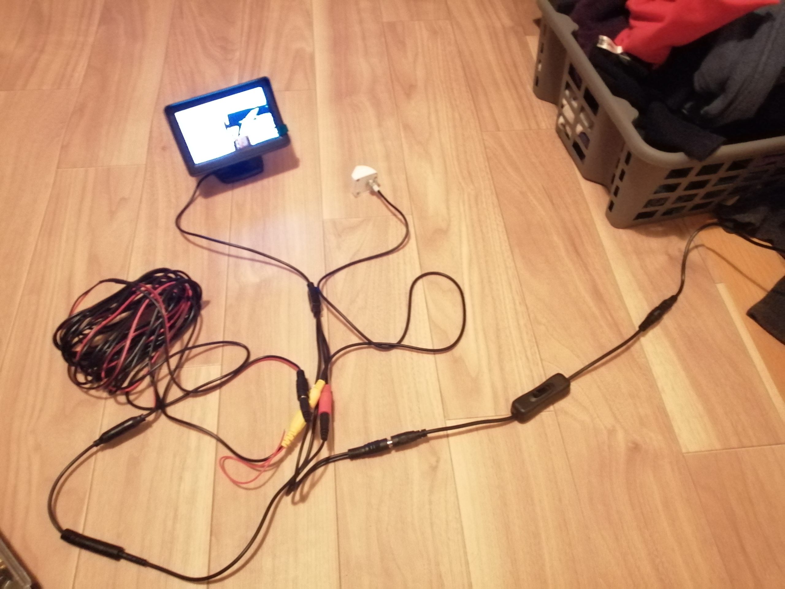 テストしてみた 根本にスイッチも付けてみた。12vコンセントからモニタ、カメラに分岐して電気供給しています。