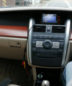 ナンバープレートのボルトを取り外し設置。このとき端子がネジ穴を通らないため、少し削る必要あり。削ったらトランクに通す。その後、端子同士を繋ぎ、ケーブルをトランクスルーから車内に通す。そして、シガーソケットから電気を取り、モニタとカメラに電気を分岐し、カメラのコンポジット端子をモニタに繫いで終了。