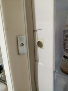 金属片とネオジウム磁石を両面テープで写真の様に固定するだけ。磁石と金属片がくっついた状態で扉を閉めると、以後、扉開けるときにくっついてくれる。