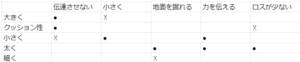 ちょっと適当に●×をつけているが、開発の場合は●×の関係性を打開する何かを生み出すと思う。例えばクッション性をあげると伝達が減ってうれしいがロスも増える。これに対し、ロスをさせずにエネルギに変換できれば、●×の関係性が減らせる。設計の場合は、上流に対し、組み合わせだけを返せばよいだろう。クッション性(タイヤの損失係数とか?)によって伝達とロスがそれぞれどうなるか?