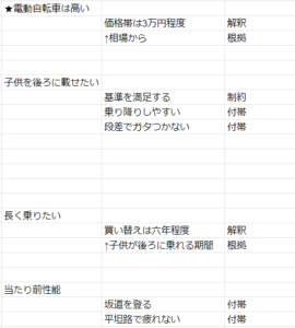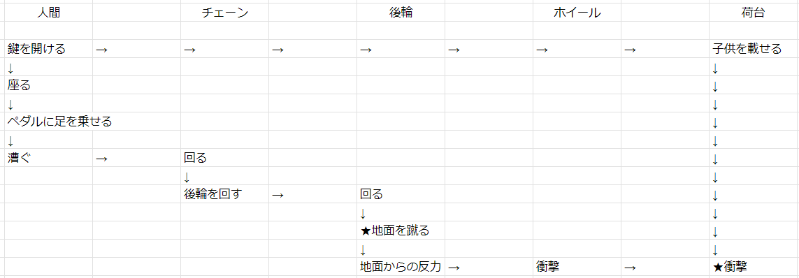 人間が乗るところから各システムがどのように動くかを整理する。ここで要求って何だっけを頭に入れておくと、例えば子供が後ろに乗る→衝撃のような気にするファクターが出るような気がする。